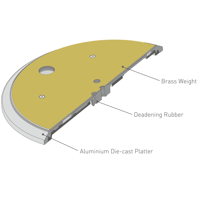 El tocadiscos tiene una construcción de tres capas con un plato de fundición a presión de latón y aluminio, que combina una estructura rígida. Una goma amortiguadora cubre toda su superficie trasera para eliminar resonancias innecesarias, logrando así una alta rigidez y amortiguación de vibraciones. Esto proporciona una estabilidad rotacional suave y una masa inercial que supera a la del SP-10MK2, el tocadiscos de accionamiento directo estándar utilizado por emisoras de radio de todo el mundo, además de tener más del doble de masa inercial que la del SL-1200MK5.