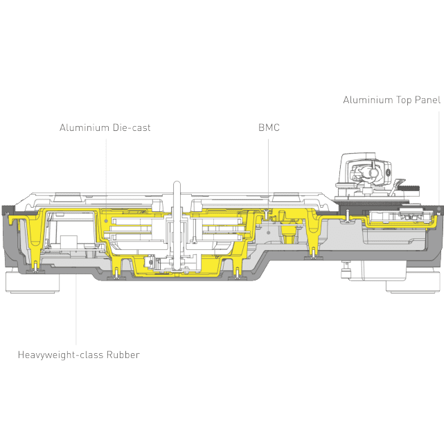 Se ha añadido un panel superior de aluminio impecable de 10 mm de grosor y procesado con precisión a la construcción anterior de tres capas de aluminio fundido a presión, BMC y caucho de alta resistencia del SL-1200MK5. Esta construcción de cuatro capas combina una alta rigidez con un acabado y una sensación de alta calidad.